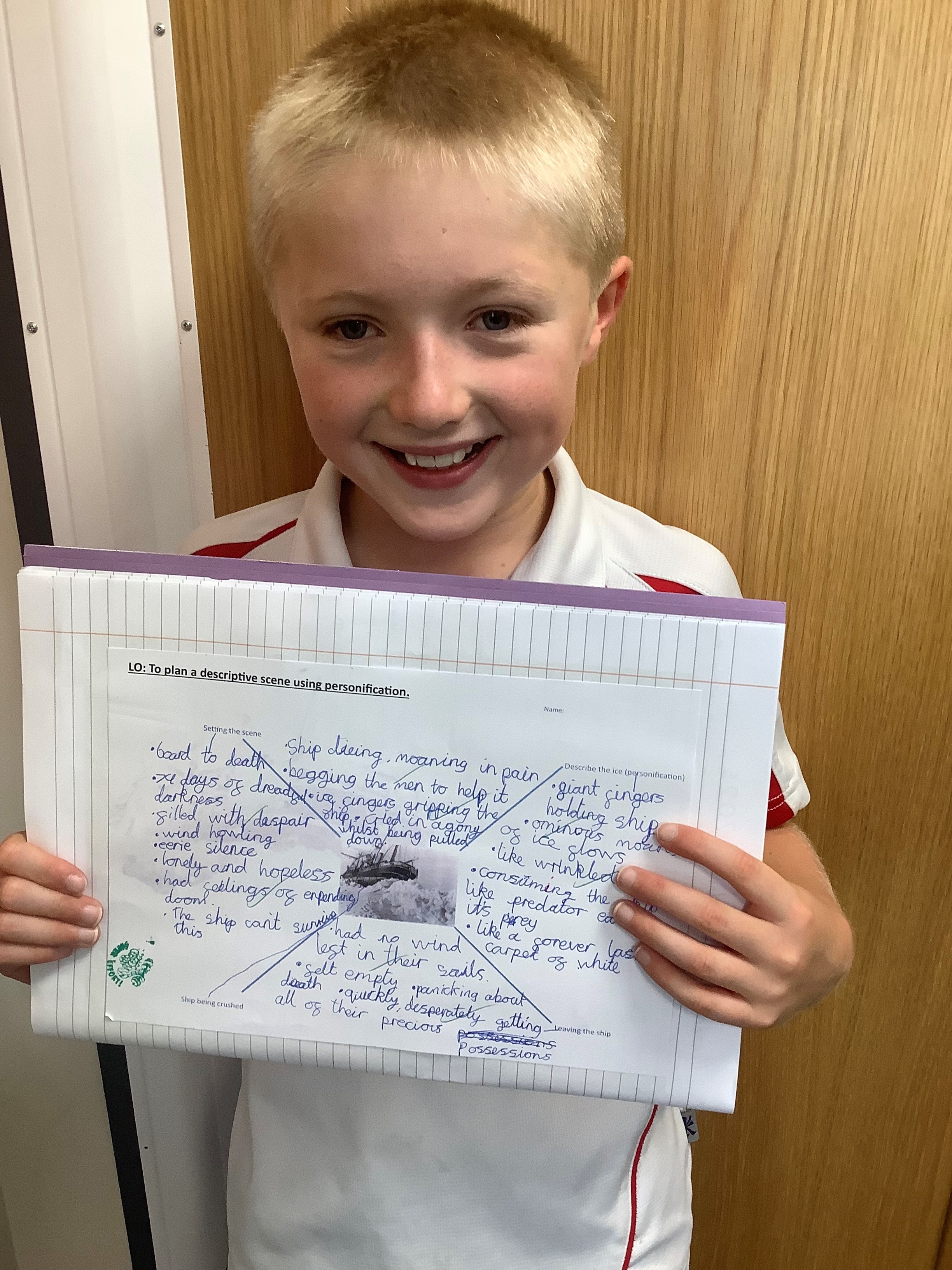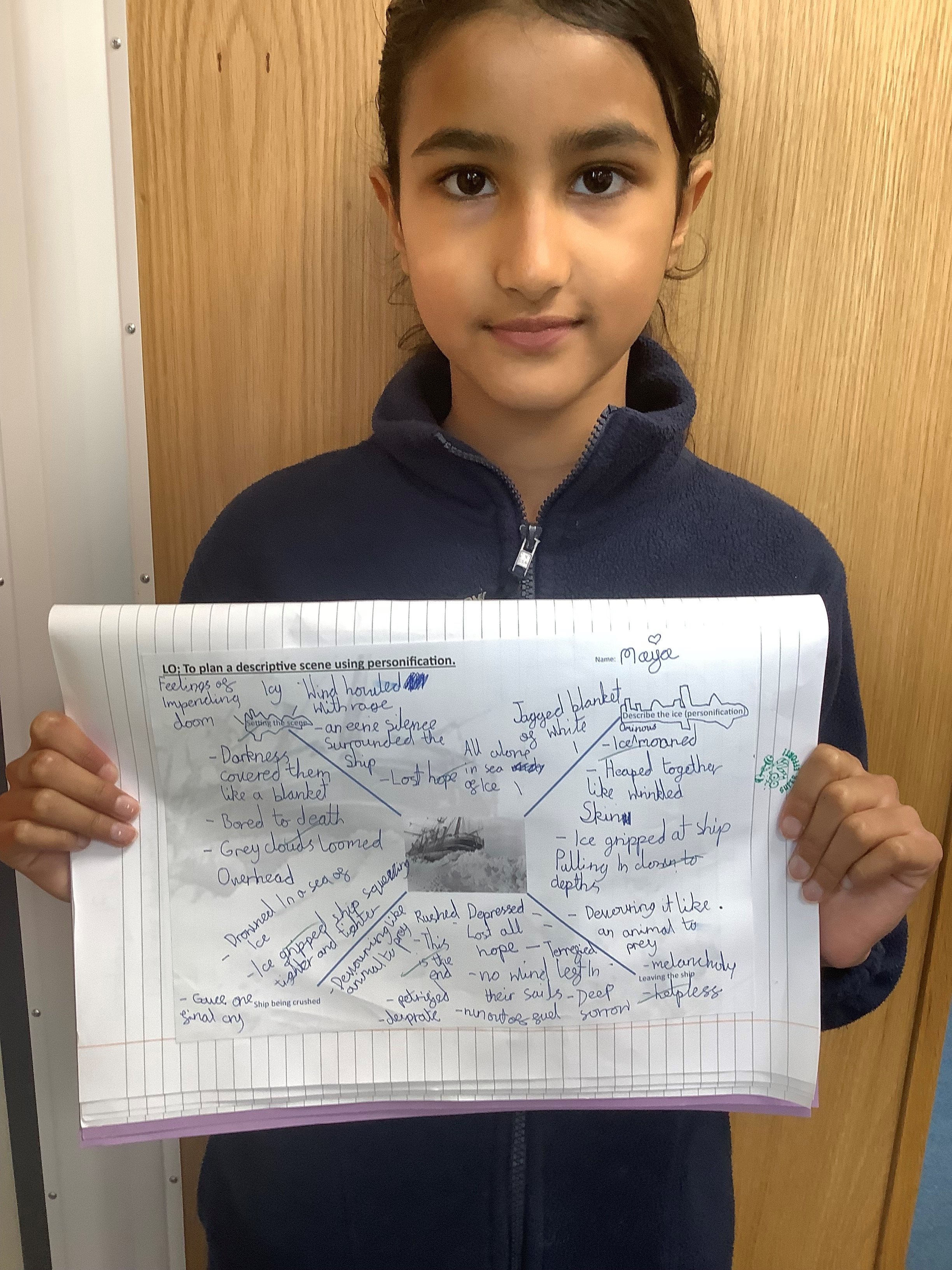 Year 5 have been honing their descriptive writing skills by learning about personification. Using powerful verbs, adjectives, and figurative language, they wrote vivid descriptions of the dramatic sinking of Ernest Shackleton’s ship, Endurance. The children then used their purple polishing pens to edit and improve their own and each other’s work — a fantastic example of collaborative learning and reflective writing.