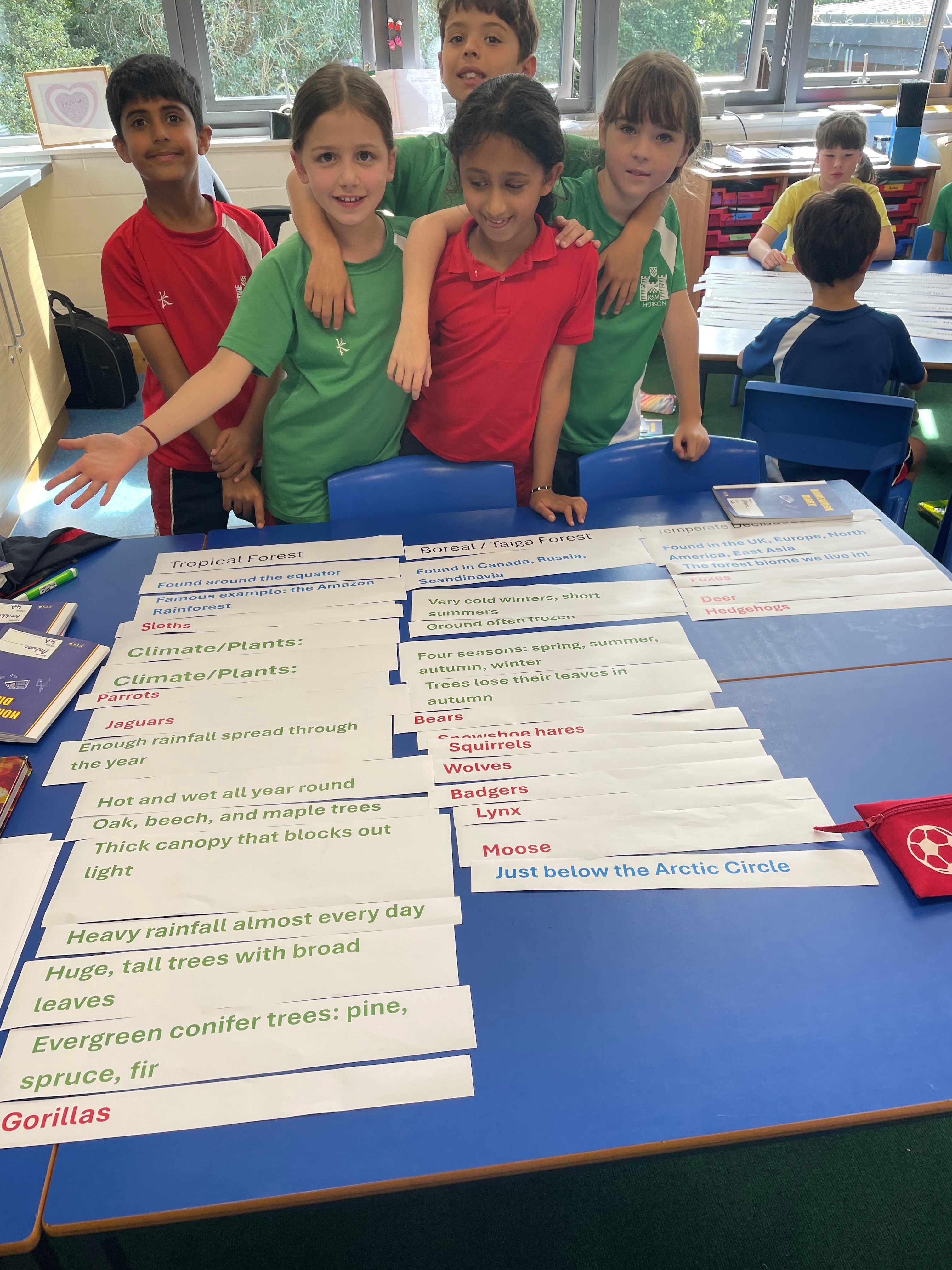 In Combined Humanities, Year 4 have been learning about forest biomes. Working in groups, they sorted information into categories such as Climate, Animals, and Other Facts, helping them understand the unique features of each biome while developing teamwork and research skills.