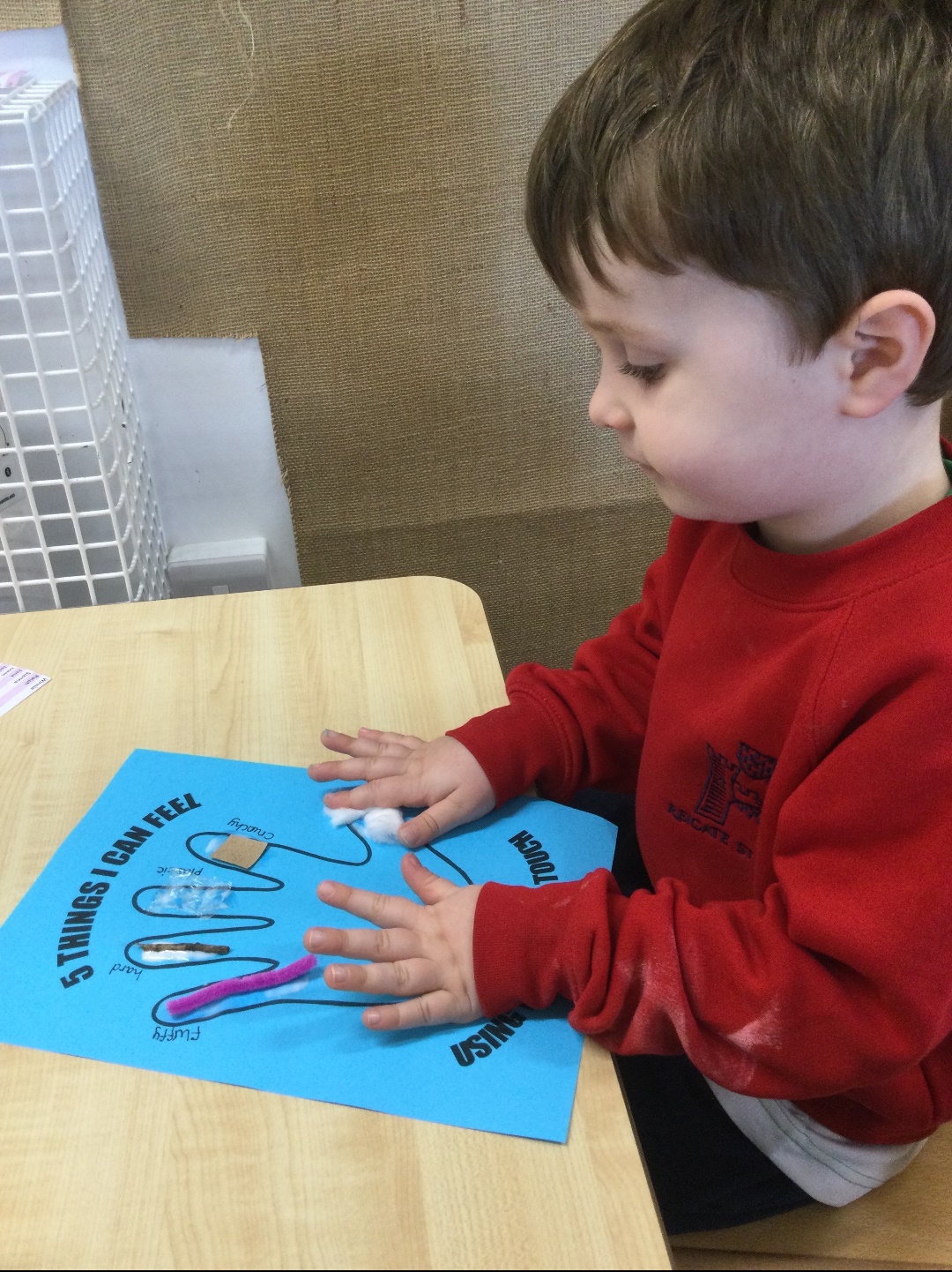 We began our senses journey by exploring our sense of touch. The children were introduced to a set of mystery "feely tubs" — each containing a hidden object. At first, some were understandably hesitant to put their hands into a box without knowing what was inside. But with gentle encouragement and the support of their peers, every child had a go — showing real bravery and growing confidence. They were delighted (and sometimes surprised!) to discover familiar textures like fluffy cotton wool, a prickly pinecone, and soft, squishy playdough. As each child took a turn, their friends eagerly watched their reactions, giggling and guessing what might be inside based on facial expressions alone. We then extended this learning by creating our own "feely hands" — paper hand shapes with a different material stuck to each finger. The children worked hard to describe each texture, using a fantastic range of vocabulary. We were particularly impressed by how many children challenged themselves to think of new and unique describing words — from “bumpy” and “smooth” to “cloudy,” “scratchy,” and even “tickly!”