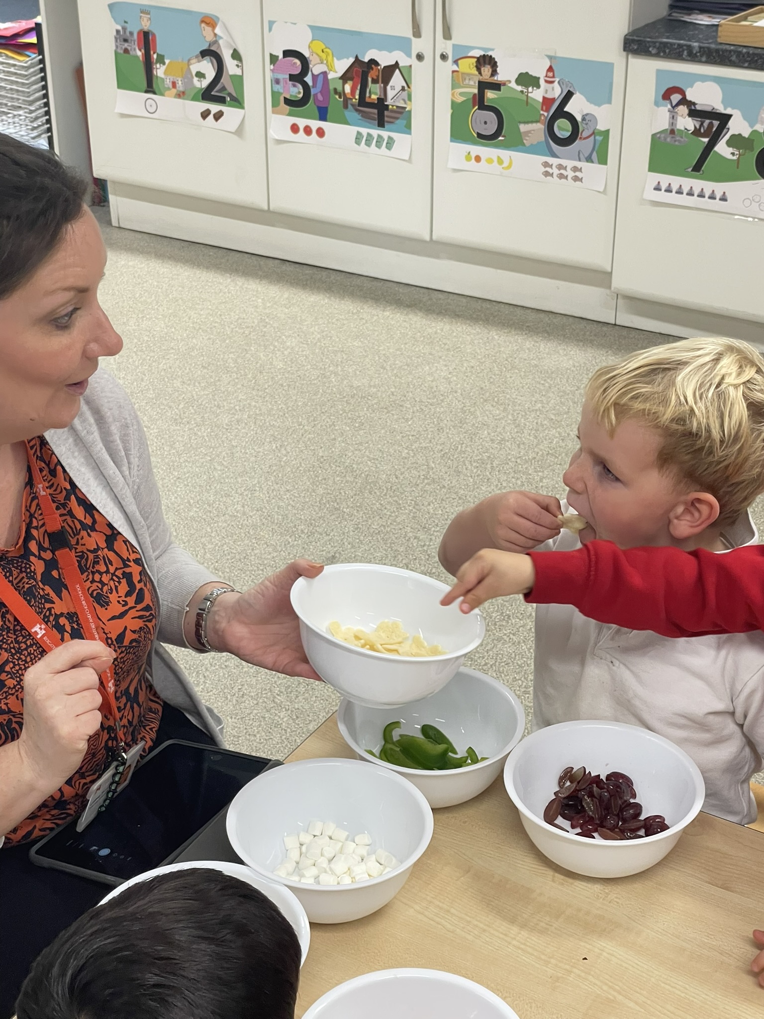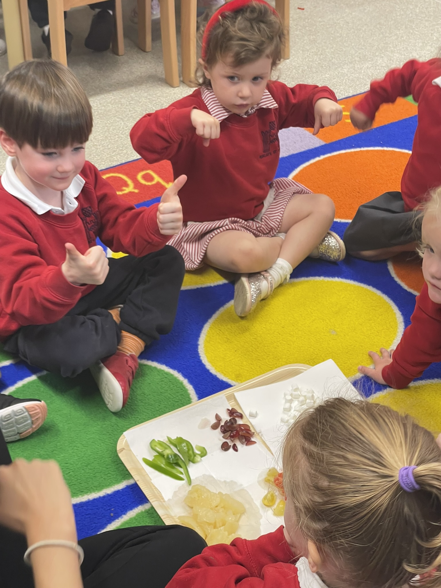Next, it was time to test our sense of taste. Thanks to our kind kitchen staff, we set up a special taste-testing table where the children were able to try a selection of different foods - slices of grapefruit, crisps, green pepper, tomatoes, a mini marshmellow, and a grape. For each item, the children were encouraged to try a small bite and then show whether they liked it by giving a thumbs up or thumbs down. Their reactions were absolutely priceless — from scrunched-up faces at the sour grapefruit to wide-eyed joy at the taste of marshmellows! This activity was a fantastic opportunity for the children to learn that everyone has different tastes and preferences — and that it’s okay to like or dislike something. It also helped to reinforce the idea of being respectful of other people’s opinions.