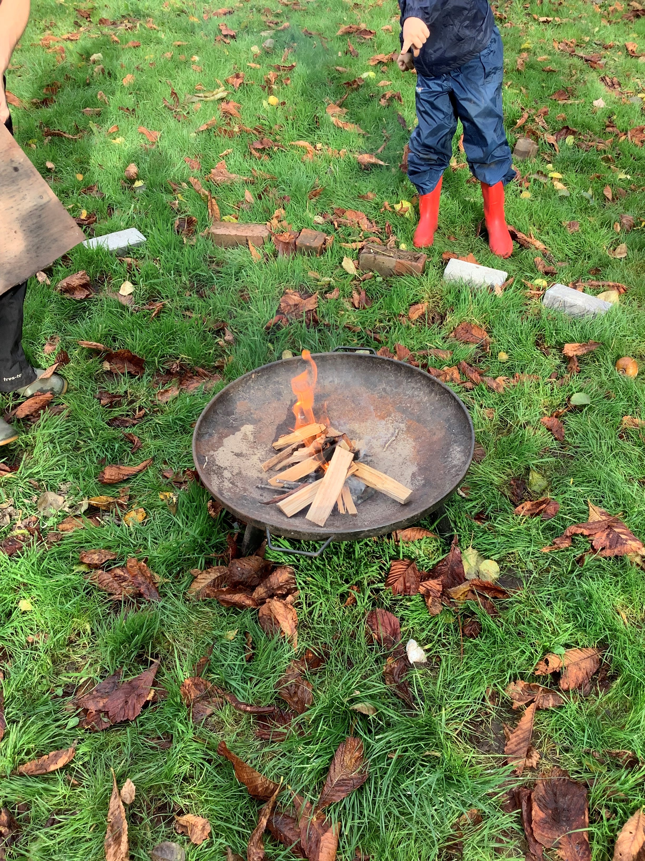 The children were split into groups and given jobs to help create the crumble - one group helped chop the apples up and practiced their knife skills, another group helped break the biscuits up using rolling pins and wood to create crumble, while the last group of children collected fire wood and helped Miss Buick create a fire in a fire pit.