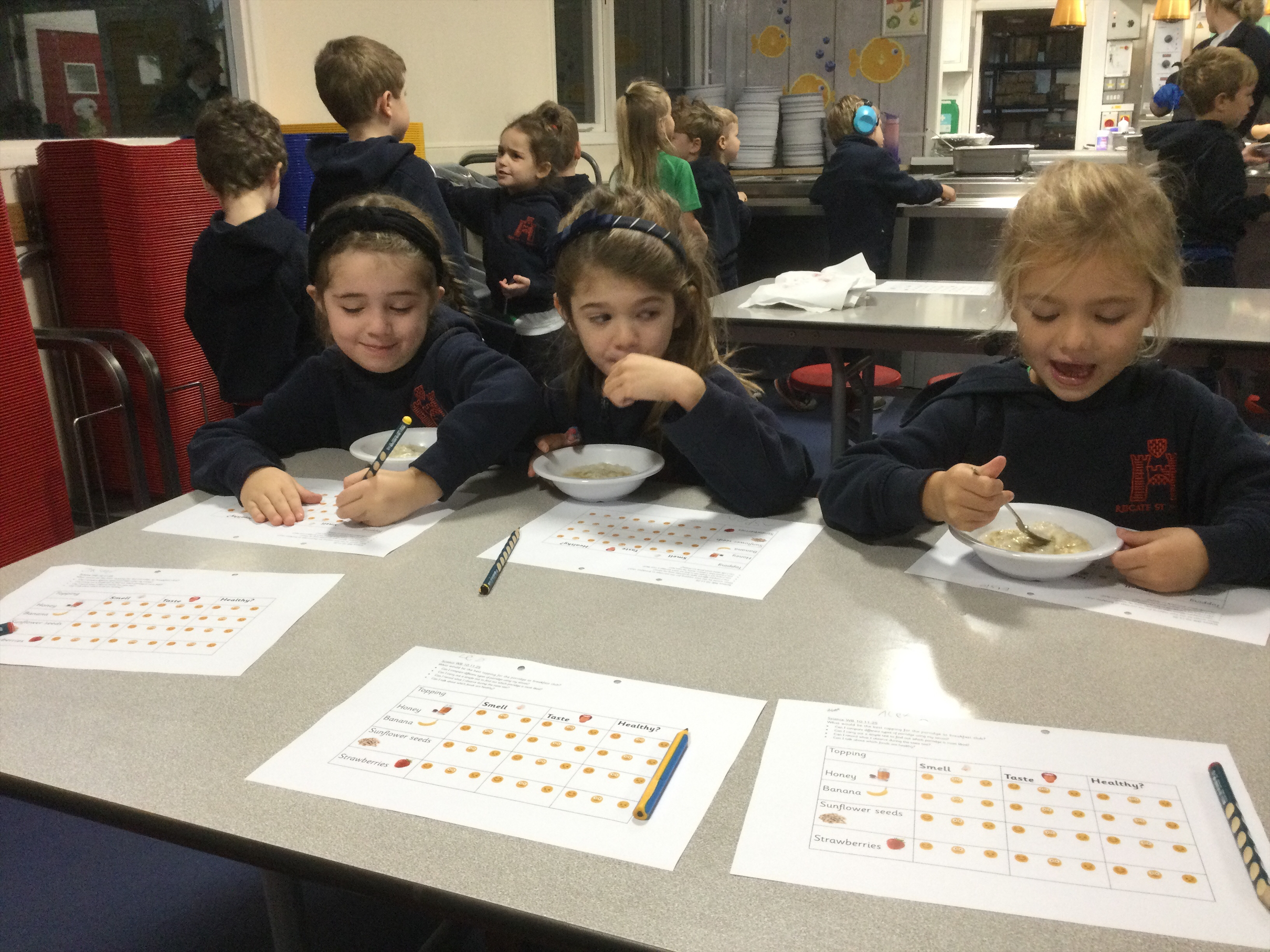 In Science, the children learned about their sense of taste through a sensory investigation. The challenge? Helping Miss Clark choose a new breakfast option for Breakfast Club! Using their senses of smell and taste, the children sampled four different porridge toppings: strawberry, banana, dates, and honey.