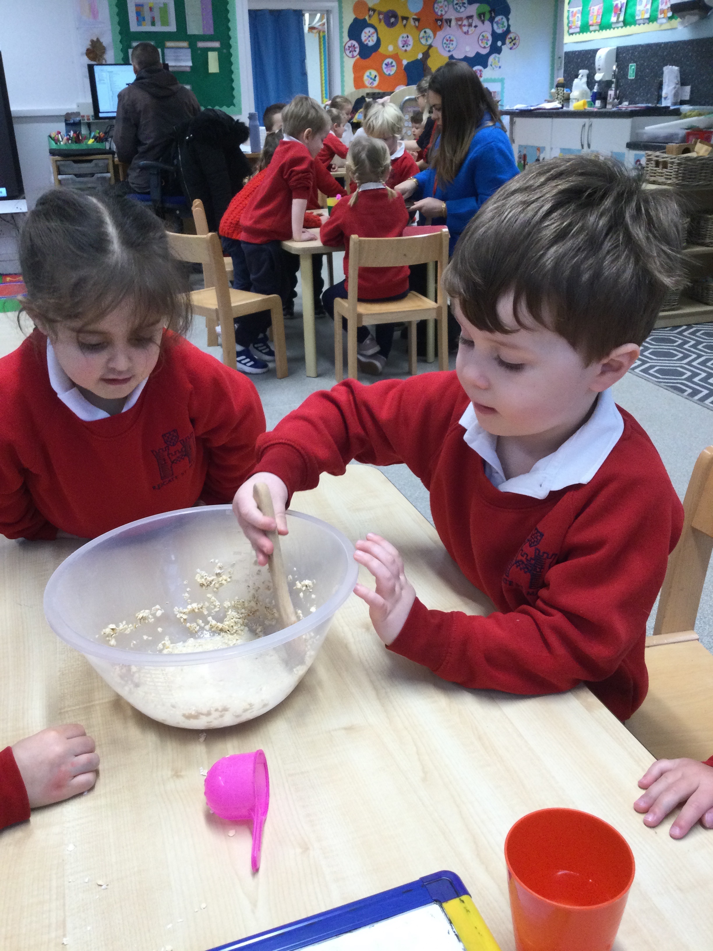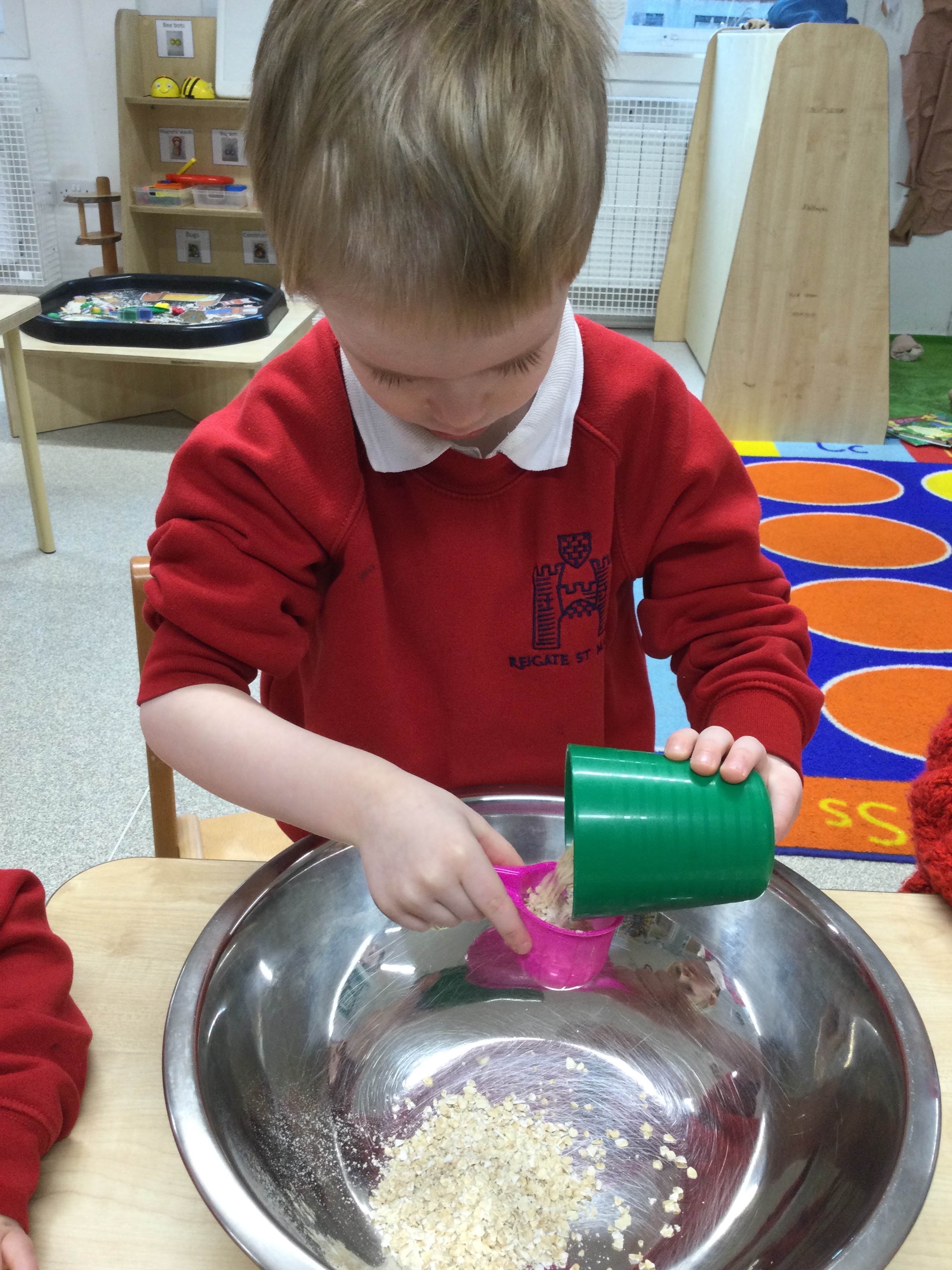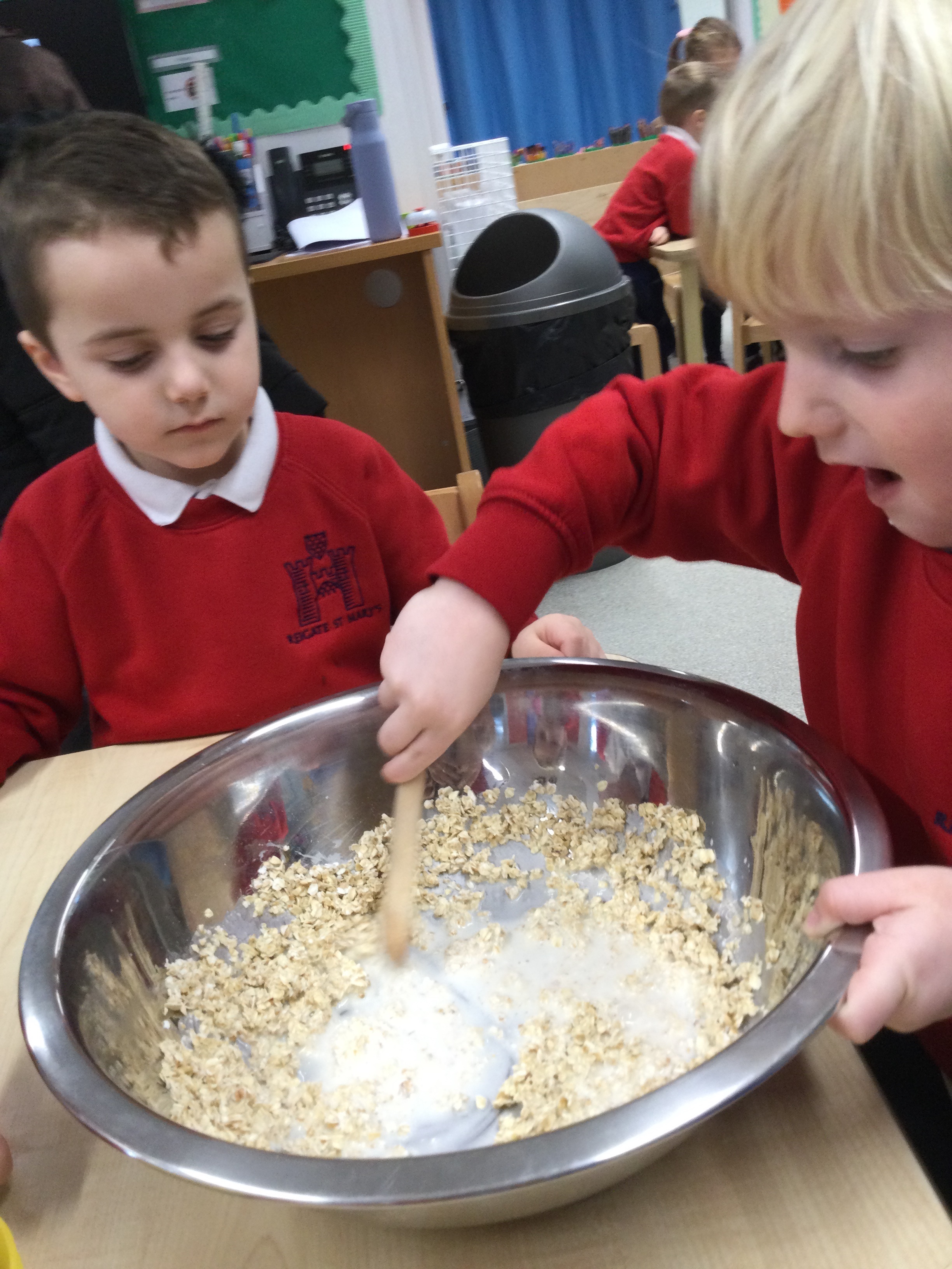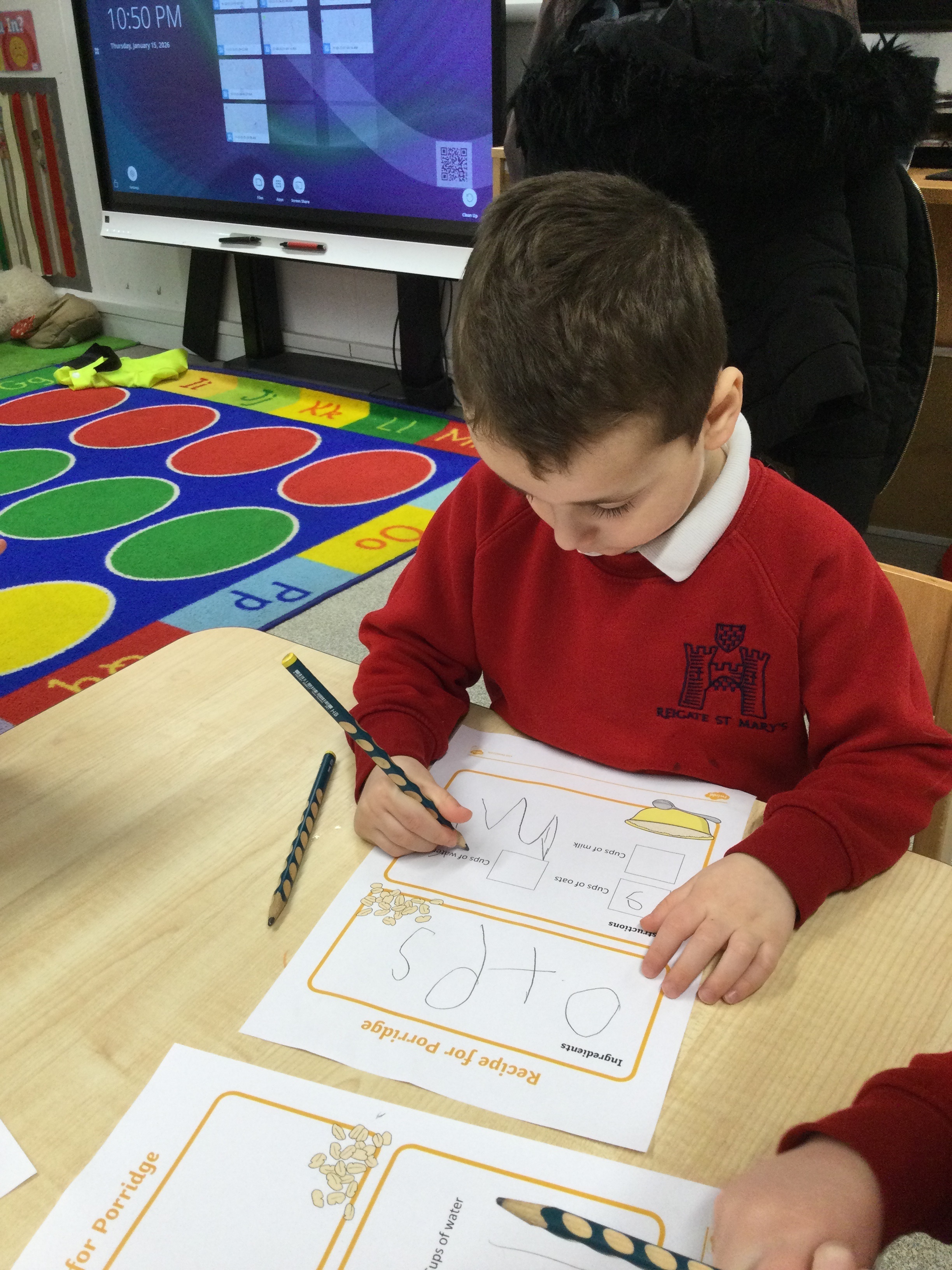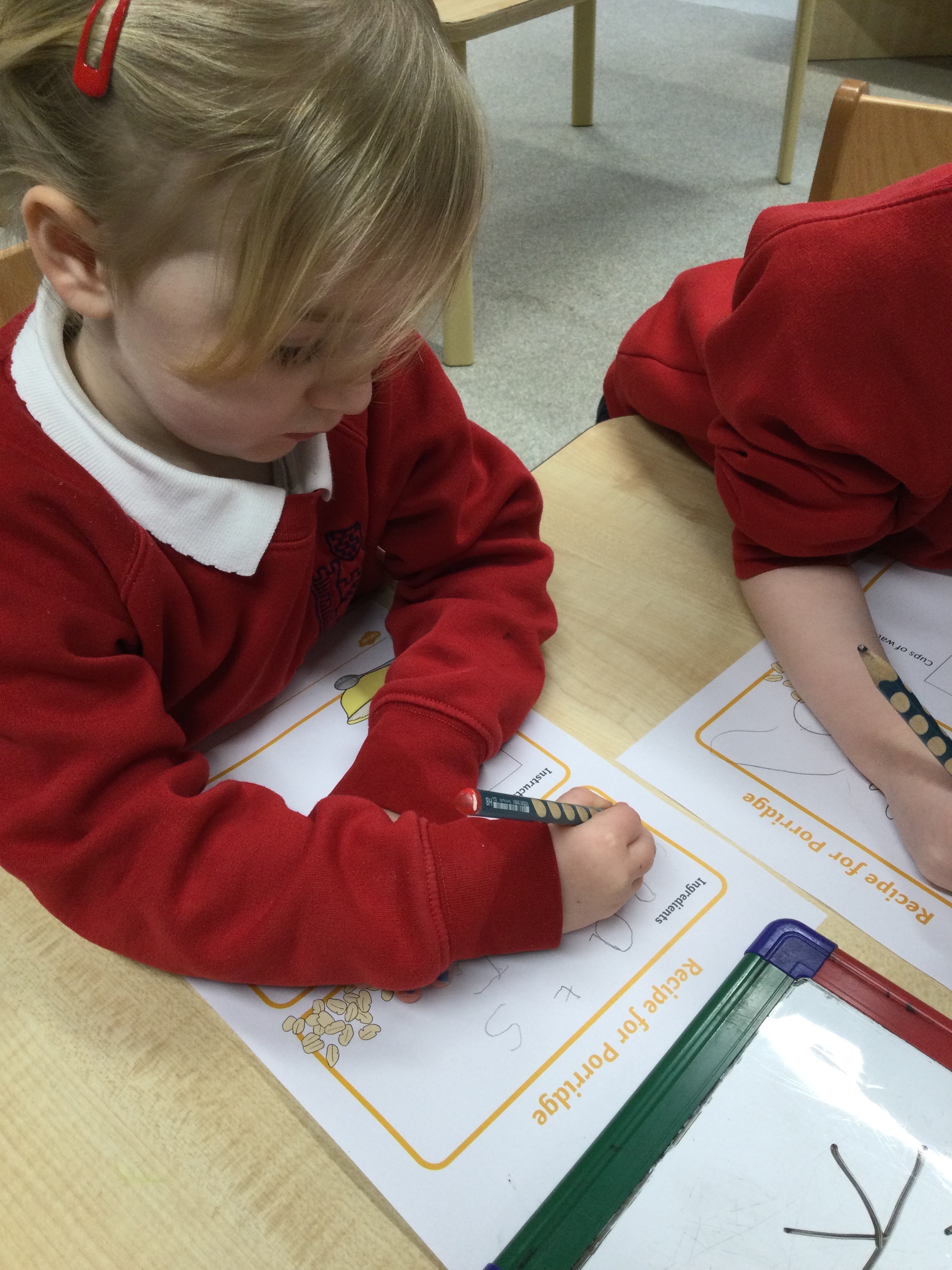 They began by writing their own porridge recipe. The children practised their best handwriting as they tried to write some of the ingredients onto their lists, doing a fantastic job at identifying and forming many of the letters.