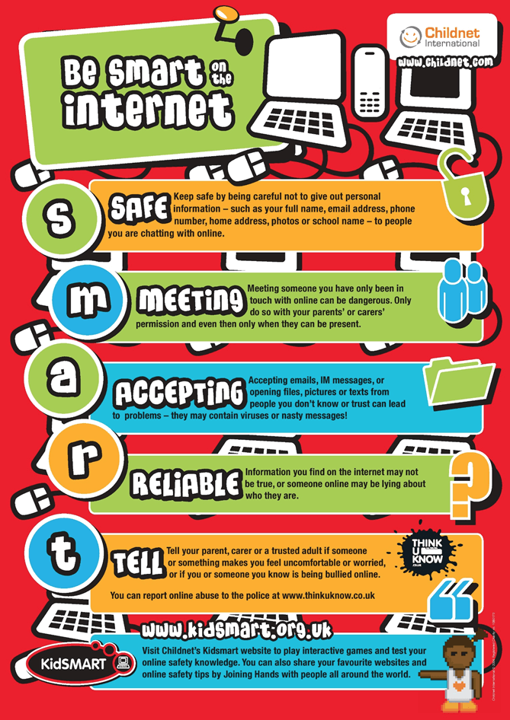 The children have discussed who uses the internet, how often they use it, and the different ways it can be used. They have also enjoyed watching Kara, Winston and the SMART Crew, completing activities linked to animations that introduce the five key SMART internet safety rules. (See poster below)